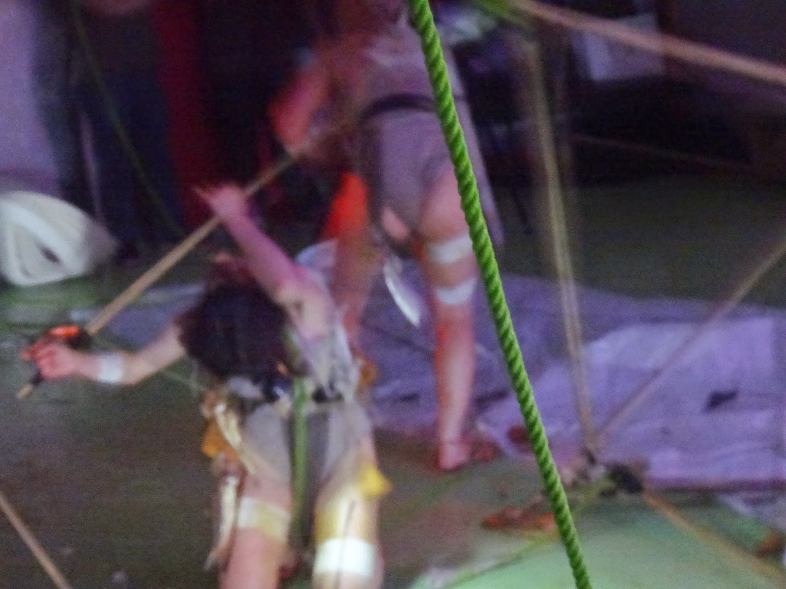 But, what was it that we saw? Two life-forms, dressed up in earth tinted bathing suits, with clusters of potatoes hanging from the crotch; acting according to a logic dictated by the task to, as fast as possible gather and carry away a number of sticks tied to the walls. A sort of manic and violent state, whose end is nothing other than the actions themselves. A sort of absurd [male, potatoes=testicles?] insanity. A negative dialectic only producing the self reflective vacuum that encloses the action without pointing to an external end.